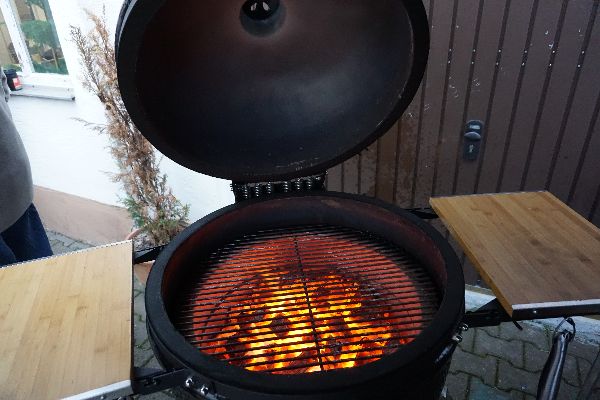 Einmal angefeuert, lässt sich der Ofen mit etwas Übung erstaunlich präzise durch die Luftzufuhr regeln. Der Temperaturbereich liegt hier zwischen 70 und 400 Grad Celsius. Mittels der Schiebetüren am Boden und am Deckel steuert man den Kamineffekt, der für schnelles oder langsames Verbrennen der Kohle und entsprechende Hitzeentwicklung sorgt. Mit wenigen Kilo Kohle kann man den Ofen bei Niedertemperatur ohne Probleme 24 Stunden lang betreiben. So schmort über Nacht der ganze Schweinenacken zum Pulled Pork zusammen. Im Hochtemperaturbereich und mit zusätzlichem Pizzastein lässt sich in den Grilleiern in Minutenschnelle auch eine fast originale Steinofenpizza backen. Ein kleiner Wermutstropfen für Nostalgie-Griller, für die eine Rauchvergiftung zur Grill-Romantik gehört: Der Kamado wird im geschlossenen Zustand bedient und raucht minimal bis gar nicht. Auf das glühend rote Grillmaster-Gesicht muss man deshalb leider auch verzichten.