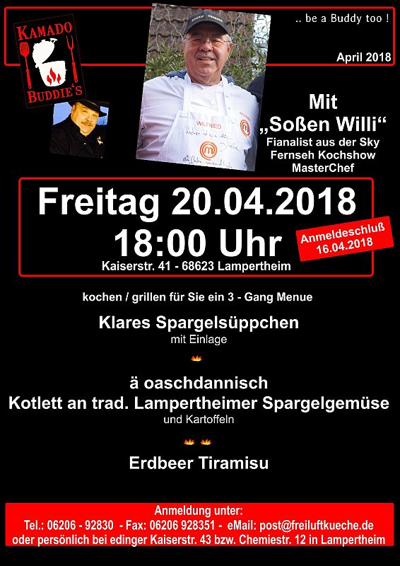 Zeige grösseres Bild Kamado Buddy Menueabend Kamado Buddy Menueabend Der Kamado Buddy Menueabend im März für Freunde des guten Geschmacks. Sosen Willy unser Masterchef Teilnehmer hat mit Frank und Mario wieder ein 4 – Gänge Menue zur Freude der anwesenden Gäste gezaubert. März 29th, 2018|Kamado Buddys Treff, Kamado Kitchen Keramikgrill Ausstellung|0 Kommentare Teile wo du es willst! FacebookTwitterLinkedInRedditTumblrPinterestVkE-Mail Über den Autor: otto Ähnliche Beiträge Grillgeräte Schnäppchen Aktion Sale und mehr Februar 11th, 2022 | 0 Kommentare Flammlachs vom Holzfeuer Kamado-Buddys Oktober 13th, 2019 | 0 Kommentare Mini Kamado Grill 99 Action August 21st, 2018 | 0 Kommentare Napoleon Gasgrill Grillausstellung Lampertheim Juli 24th, 2018 | 0 Kommentare Kamado Outdoorküche Ideen zum Mitmachen gestalten und zeigen Juni 15th, 2018 | 0 Kommentare Hinterlasse einen Kommentar Antwort abbrechenKommentar